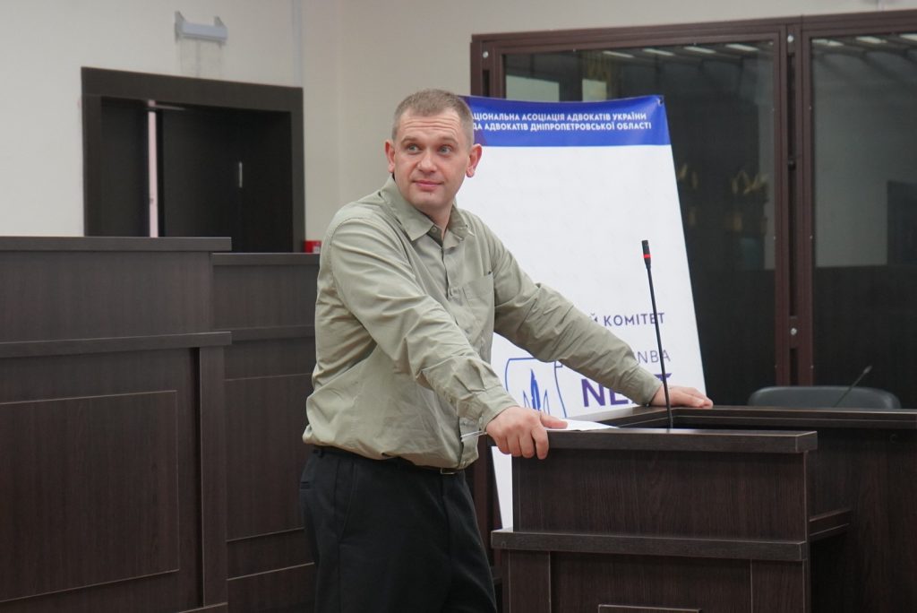 Під час зустрічі виступили досвідчені юристи. Анатолій Пономарьов, партнер Адвокатського об’єднання «DNIPROLEX» та волонтер, поділився власними спостереженнями у доповіді «In-house чи адвокат? Що краще для юриста на старті».