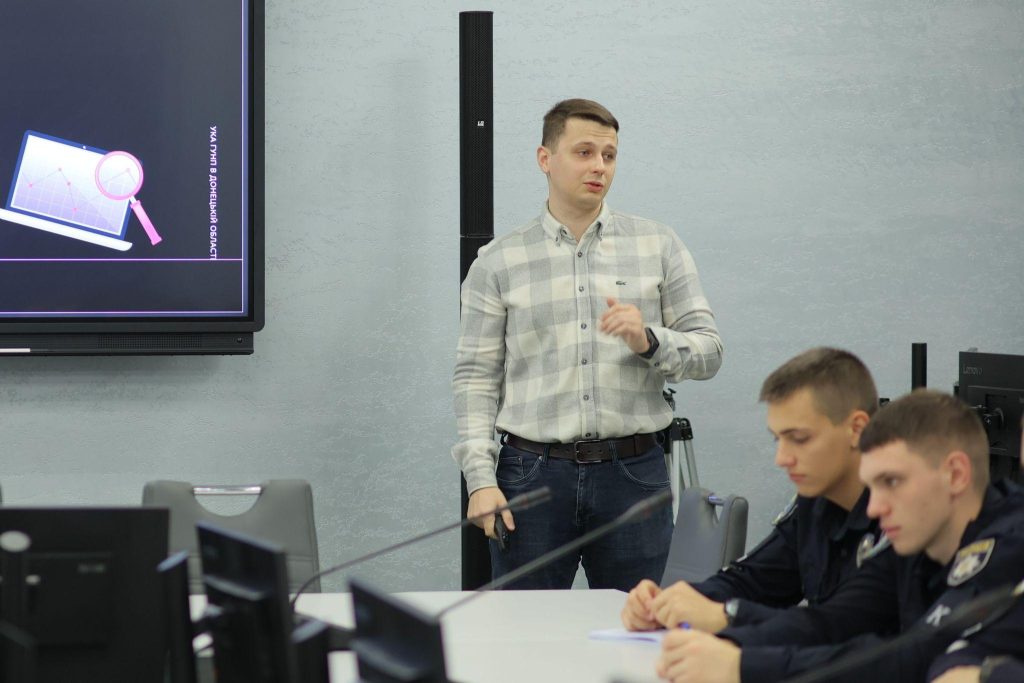 Заняття за темою «Використання OSINT та GEOSINT методів у розслідуванні відносно осіб, що посягають на територіальну цілісність і недоторканність України» проводилось старшим інспектором з особливих доручень Управління кримінального аналізу ГУНП в Донецькій області старшим лейтенантом поліції Даниїлом Булі.