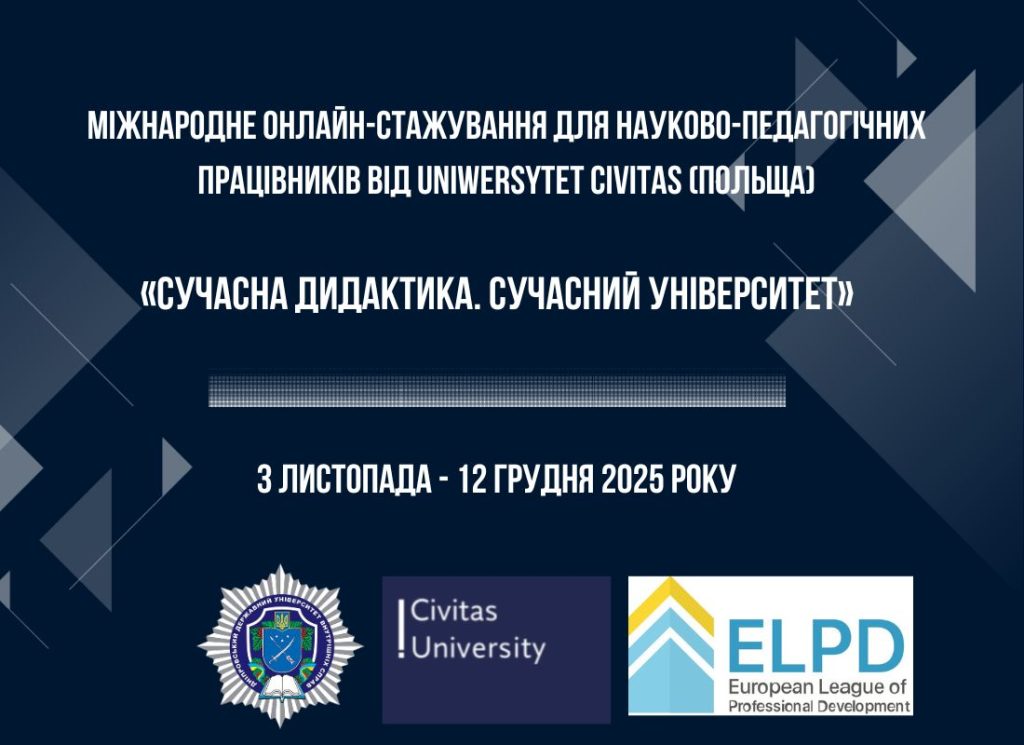 З 3 листопада по 12 грудня 2025 року на базі Uniwersytet Civitas (Польща) у співпраці з «Європейською лігою професійного розвитку» відбудеться міжнародне онлайн-стажування для педагогічних і науково-педагогічних працівників закладів вищої освіти за темою: «Сучасна дидактика. Сучасний університет».