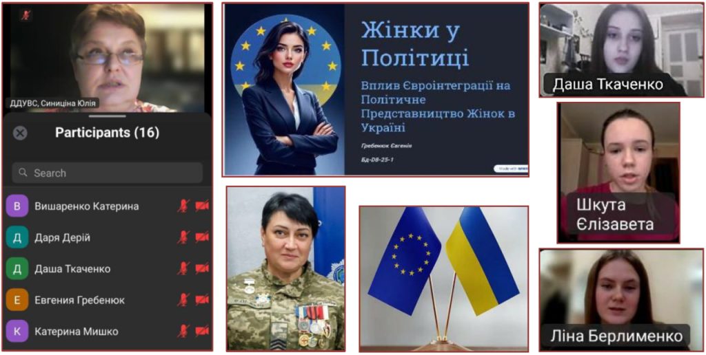 У зустрічі взяли участь здобувачі вищої освіти Навчально-наукового інституту права та інноваційної освіти, що навчаються за спеціальністю «Право». Використовуючи знання із сучасних інформаційних технологій, здобувачки групи Бд-Д8-25-1 підготували доповіді та презентації до них, у яких розповіли про втілення політики гендерної рівності в різні сфери суспільного життя України: Ірина Канишева надала інформацію про поняття Євроінтеграції та етапи її впровадження в Україні; Дарія Ткаченко розповіла про гендерну нерівність, проілюструвавши свою доповідь цікавими прикладами; Єлизавета Шкута торкнулася питання рівності чоловіків і жінок у контексті євроінтеграційних процесів у нашій країні; Ліна Берлименко доповіла про гендерну рівність на ринку праці, акцентувавши увагу на викликах і можливостях для нашої держави; Тайра Гук поінформувала присутніх про жінок у політиці, а також про вплив євроінтеграції на політичне представництво жінок в Україні.