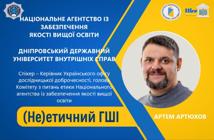 Спікер заходу – керівник Українського офісу дослідницької доброчесності, Голова Комітету з питань етики Національного агентства із забезпечення якості вищої освіти Артем Артюхов.
