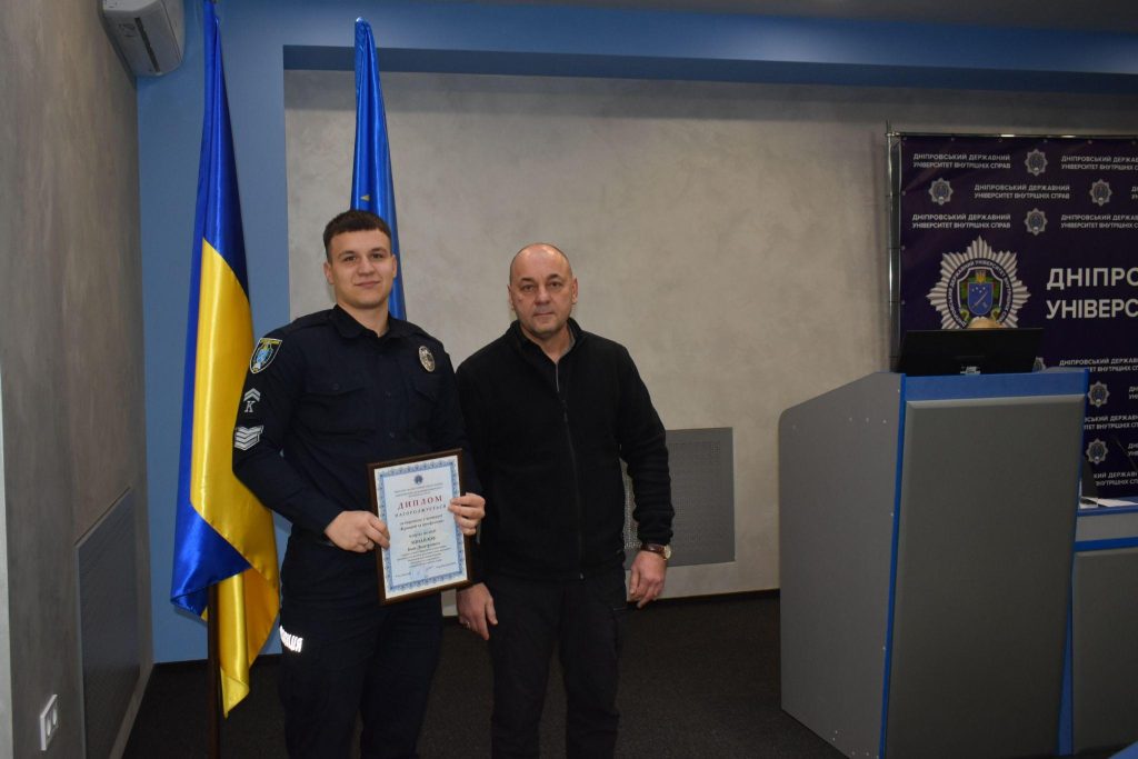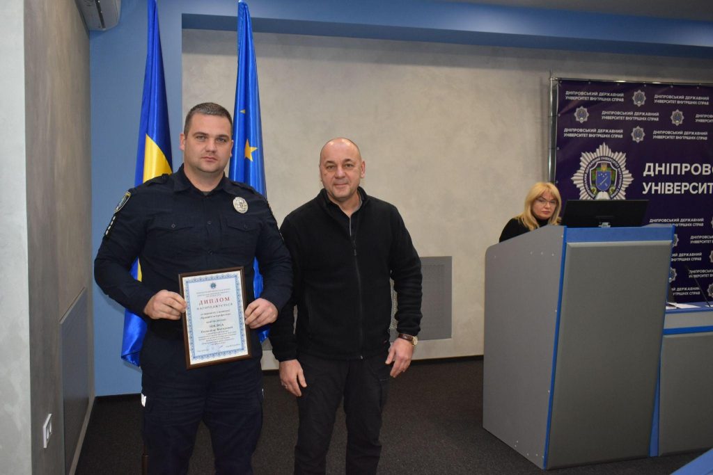 За високий рівень професійної майстерності, уміння діяти в екстремальних умовах, ініціативність і наполегливість, проявлені під час участі у конкурсі «Кращий за професією» серед працівників та здобувачів вищої освіти Дніпровського державного університету внутрішніх справ дипломом за перемогу у конкурсі «Кращий за професією» нагороджено старшого викладача кафедри кримінального процесу факультету підготовки фахівців для органів досудового розслідування НПУ капітана поліції Олександра Неклесу. Таким самим дипломом нагороджено курсанта 4 курсу факультету підготовки фахівців для органів досудового розслідування НПУ Івана Мінайлова.