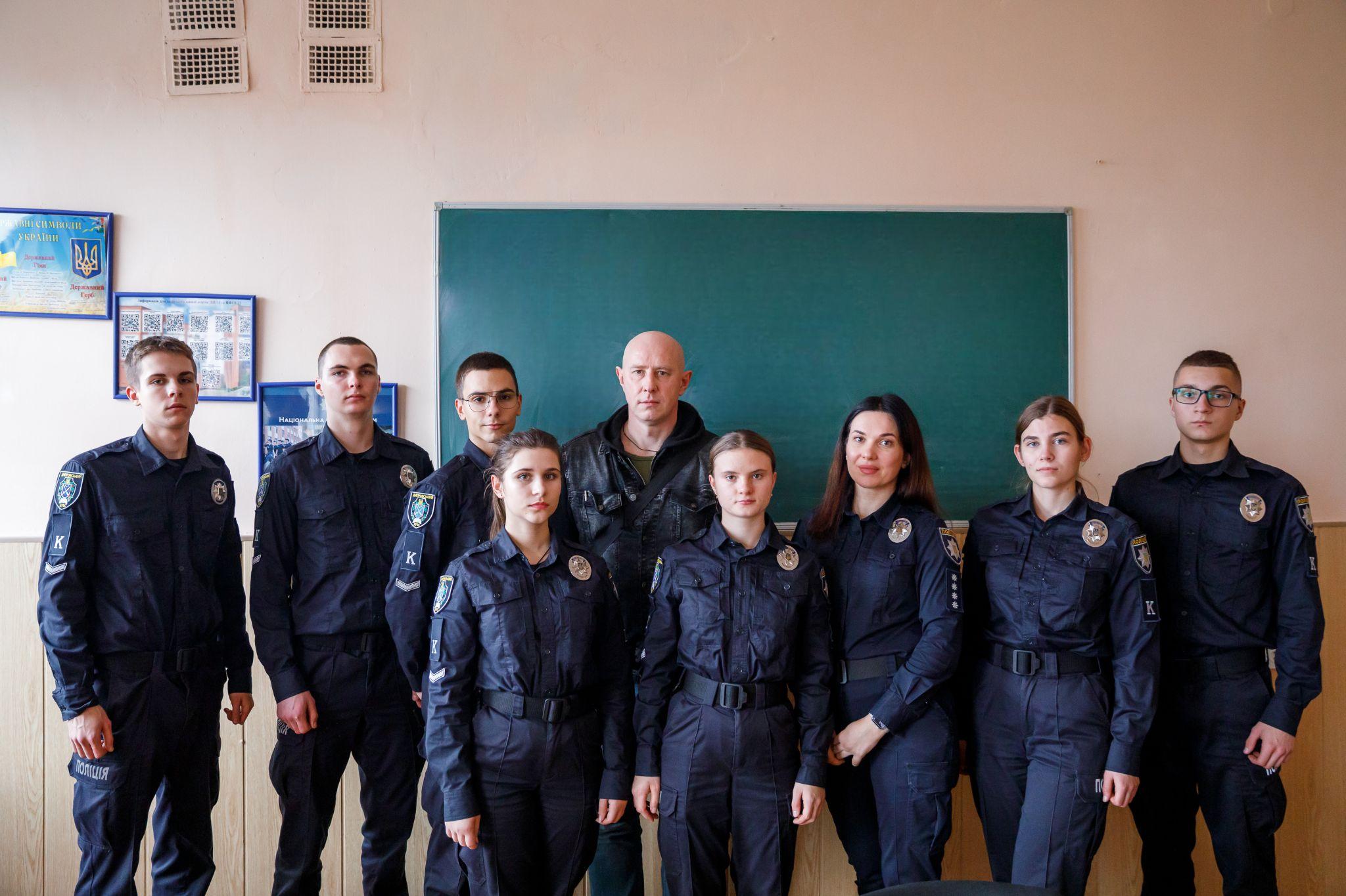 Костянтин Ходак поділився спогадами та роздумами, сформованими під час участі бойових діях. Він наголосив на важливості життєвих цінностей, мужності, громадянської свідомості та готовності кожного українця захищати свою державу. Також обговорено питання формування патріотизму, стійкості та відповідального ставлення до майбутньої професії поліцейського.