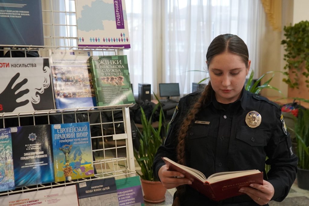 На експозиції представлено книжкові та періодичні видання, що висвітлюють різні види насильства, сучасні методи його попередження, питання рівності жінок та чоловіків, а також механізми захисту прав людини. Відвідувачі мали можливість ознайомитися з матеріалами, які сприяють формуванню культури безпеки та відповідального ставлення до проблеми насильства в суспільстві.