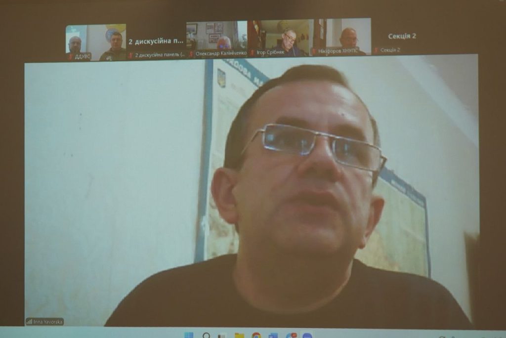 Із доповіддю на тему “Роль добровольчих формувань територіальної громади у базовій підготовці військових: на прикладі ДФТГ «Варта Дніпра»” виступили директор Навчально-наукового інституту права та інноваційної освіти ДДУВС, доктор юридичних наук, професор Володимир Шаблистий та ветеран російсько-української війни, здобувач вищої освіти ДДУВС Сергій Басінов.