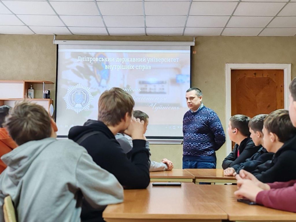 Профорієнтаційну зустріч на базі Дніпровського вищого професійного училища будівництва провів доцент кафедри кримінального права та кримінології Валентин Людвік. Під час бесіди детально розкриті вимоги до абітурієнтів ДДУВС, зокрема, складання НМТ, проходження спеціальних перевірок та медичних комісій. Наголошено на важливості фізичної підготовки та моральної стійкості вступників.