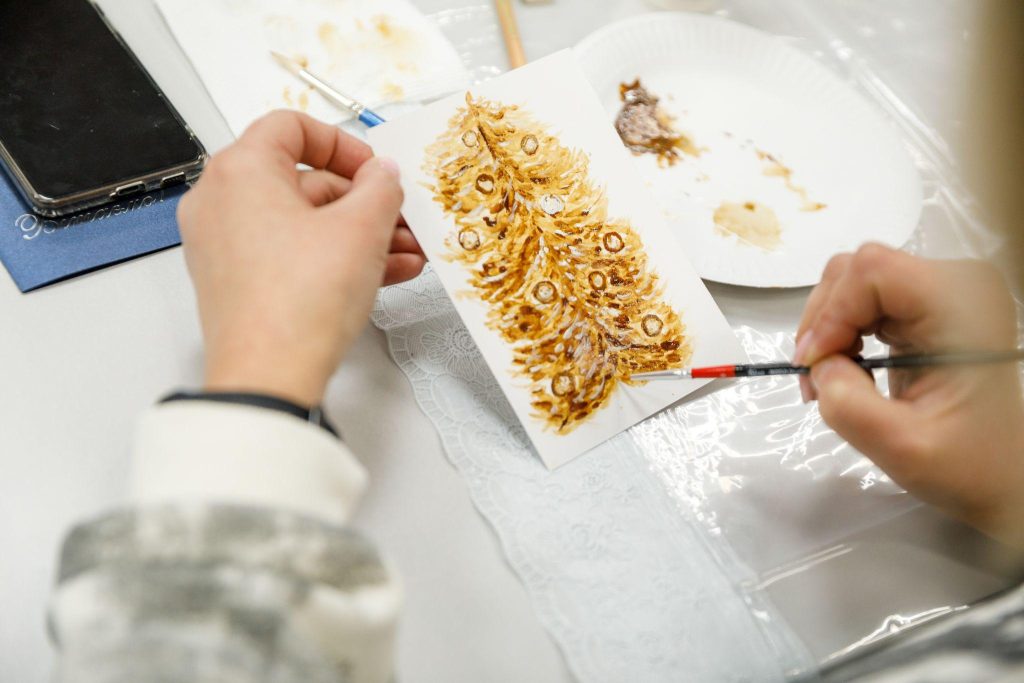 Під час зустрічі учасники ознайомилися з технікою створення картин за допомогою завареної кави, яка надає роботам теплих брунатних відтінків та приємного аромату, імітуючи ефект акварелі.