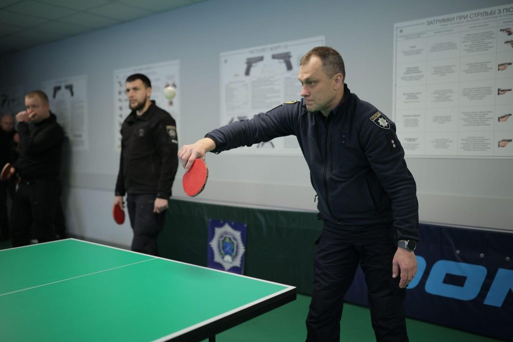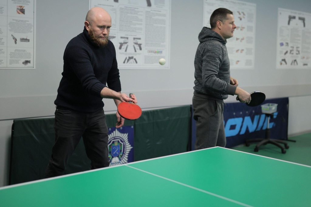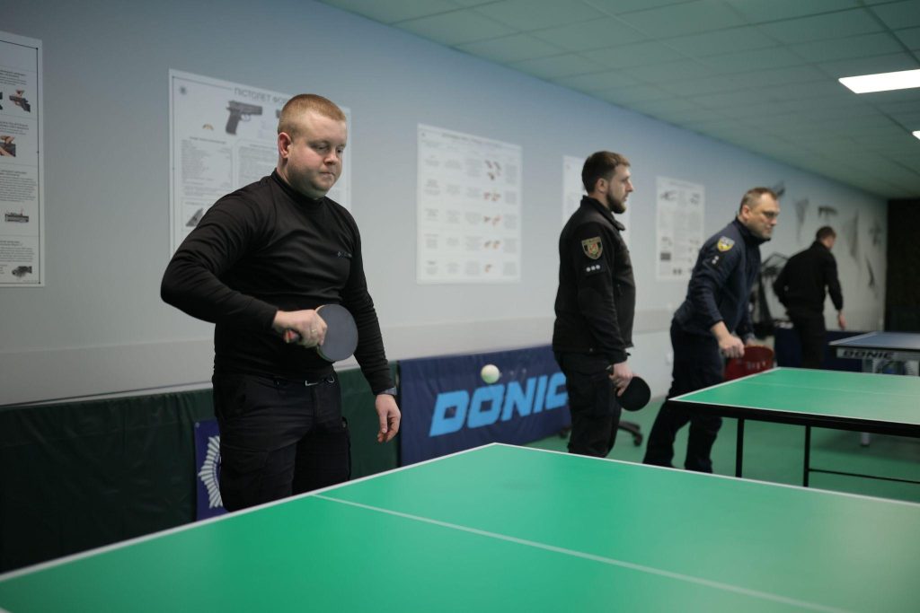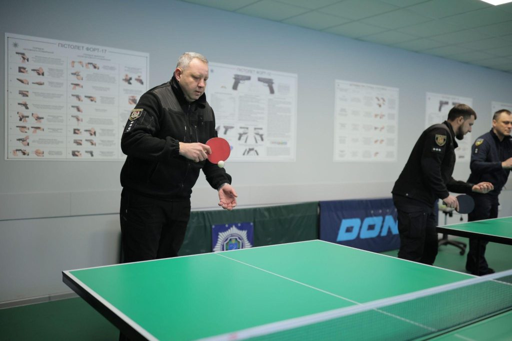 Офіцери поліції Луганщини, які нещодавно повернулися з виконання службових завдань у зоні бойових дій, разом із військовими ветеранами, які тренуються на базі ДДУВС, відпрацьовували основні прийоми гри в настільний теніс: подачу м’яча, захист своєї половини поля, рух біля столу та інші елементи гри.