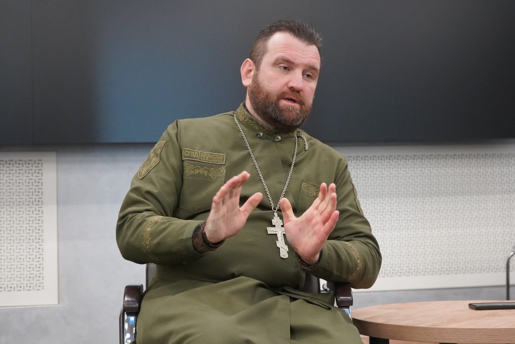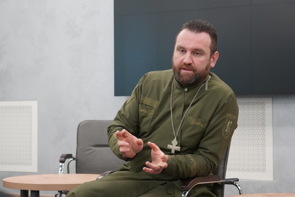 Гість розповів про свій життєвий шлях: здобуту освіту, службу в лавах Національної гвардії України та покликання до капеланської діяльності. Він детально пояснив, у чому полягає суть капеланської служби у війську, які обов’язки несуть священики, як вони надають духовну, психологічну та моральну допомогу військовослужбовцям і тим, хто її потребує.