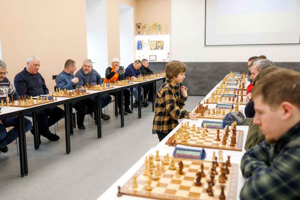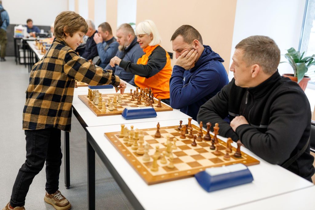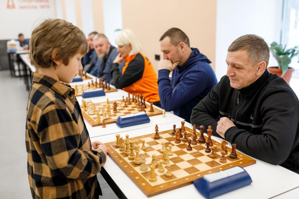 Юний шахіст по черзі підходив до кожної дошки, демонструючи високу концентрацію, витримку та впевненість, тоді як учасники відповідали досвідом, стратегічним мисленням і справжнім спортивним азартом.