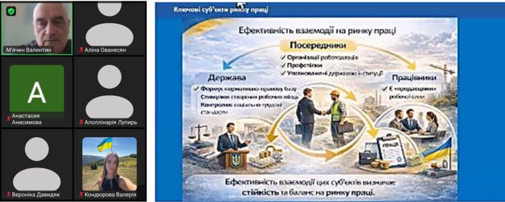 19 лютого відбулося чергове онлайн-засідання наукового гуртка кафедри соціально-економічних дисциплін за темою «Інституційні засади розвитку ринку праці в Україні в умовах післявоєнного економічного відновлення», яке відвідали здобувачі Навчально-наукового інституту права та інноваційної освіти, викладачі кафедри та Олександр Мирошниченко, випускник нашого університету, фахівець у галузі ІТ-технологій.