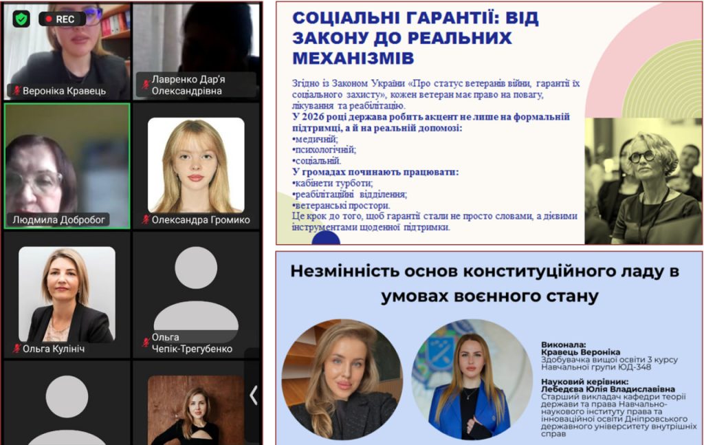 26 лютого відбулося онлайн-засідання наукового гуртка «Актуальні проблеми правотворення та правозастосування» кафедри теорії держави та права, присвячене проблемам правового статусу ветеранів війни в Україні та незмінності основ конституційного ладу в умовах воєнного стану.