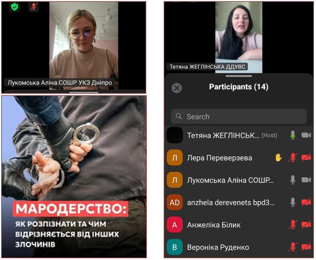 27 лютого в онлайн-форматі відбулося засідання наукового гуртка кафедри кримінально-правових дисциплін за темою «Новели кримінального та кримінального процесуального законодавства в умовах четвертого року війни», у якому взяли участь здобувачі вищої освіти ННІ ПІО та запрошена гостя Аліна Лукомська, інспектор відділу комплектування управління кадрового забезпечення Головного управління Національної поліції в Дніпропетровській області, старший лейтенант поліції.