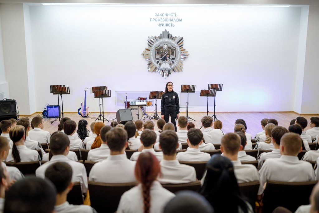 Начальниця відділу соціально-гуманітарної роботи ДДУВС, підполковниця поліції Наталія КАРНАУХ розповіла ліцеїстам про історію створення Гімну, його значення як символу державності, єдності та незламності українського народу, а також про етапи офіційного затвердження державного символу.