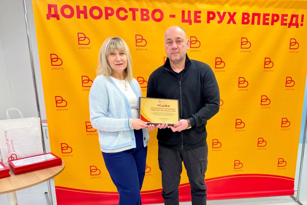 З керівництвом донорського центру Biopharma Plasma Дніпро зустрівся тимчасово виконуючий обов’язки ректора ДДУВС Ігор Магдаліна. Керівниця центру Ірина Кільчинська подякувала представникам університету за активну громадянську позицію та чуйність до тих, хто потребує допомоги.