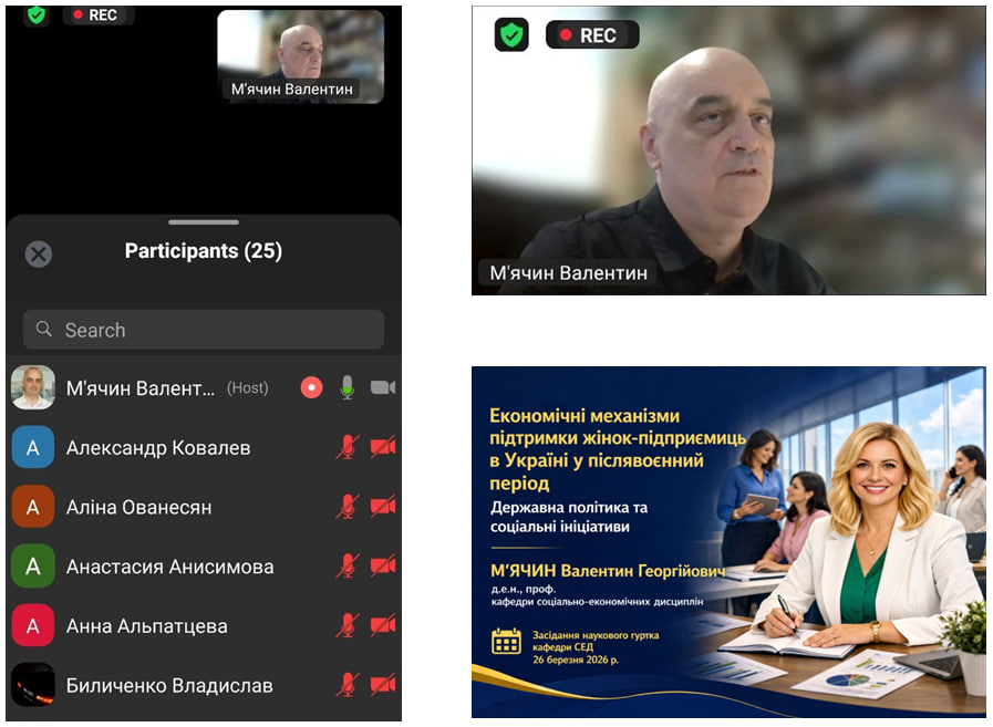 26 березня кафедра соціально-економічних дисциплін провела засідання наукового гуртка, де розглядалися питання державної політики та соціальних ініціатив щодо підтримки українських жінок-підприємиць у післявоєнний період.