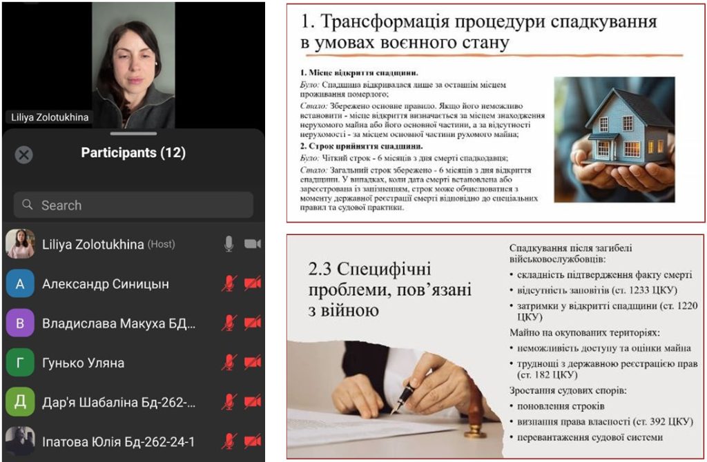На засіданні із змістовними доповідями виступили магістранти Максим Маслов, Уляна Гунько та Вікторія Ясногор, які розповіли про трансформацію процедури спадкування в умовах воєнного стану; специфічні проблеми, пов’язані з війною, як-от спадкування після загибелі військовослужбовців, спадкування майна на окупованих територіях та ін.; особливості спадкування щодо окремих категорій осіб, зокрема ВПО, безвісти зниклих тощо.