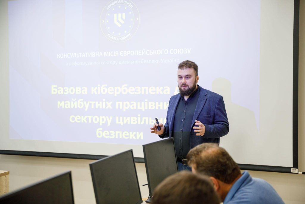 Christopher Elliott, Advisor on Criminal Investigations of Organized Crime, and Dmitry Yehorov, EUAM Information Technology Specialist, alongside DSUIA Senior Lecturer of the Information Technology Department Serhii Prokopov, thoroughly addressed contemporary cyber threats and strategies to mitigate risks.
