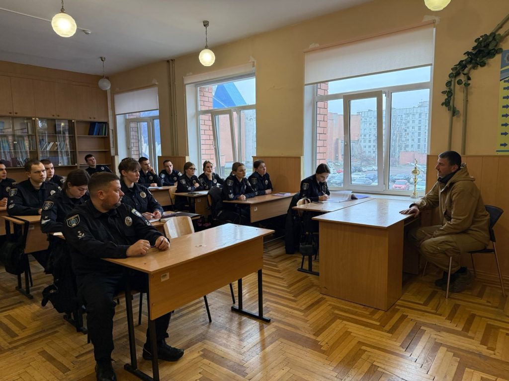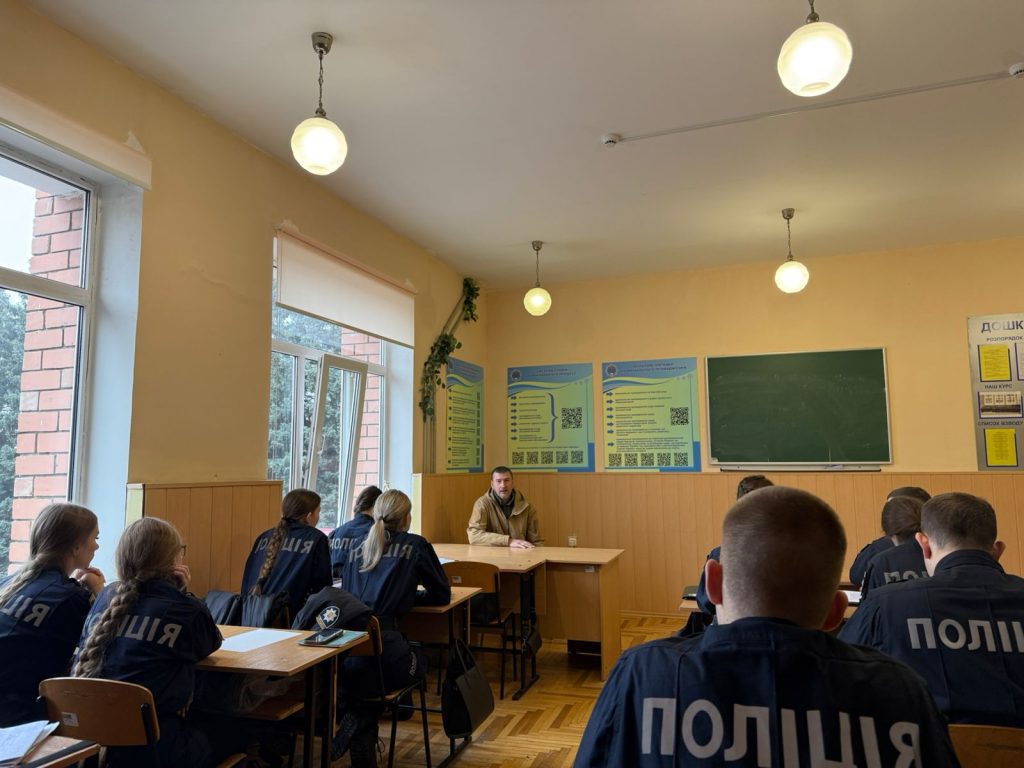 As part of the event, cadets of study group DR-242 from the Faculty of Training Specialists for the Pre-Trial Investigation Bodies of the National Police of Ukraine met with war veteran Vyacheslav Lysenko, who, at the beginning of the full-scale invasion by the Russian Federation, voluntarily joined the Armed Forces of Ukraine, where he served as a senior soldier and rifleman-operator in the Donetsk region.