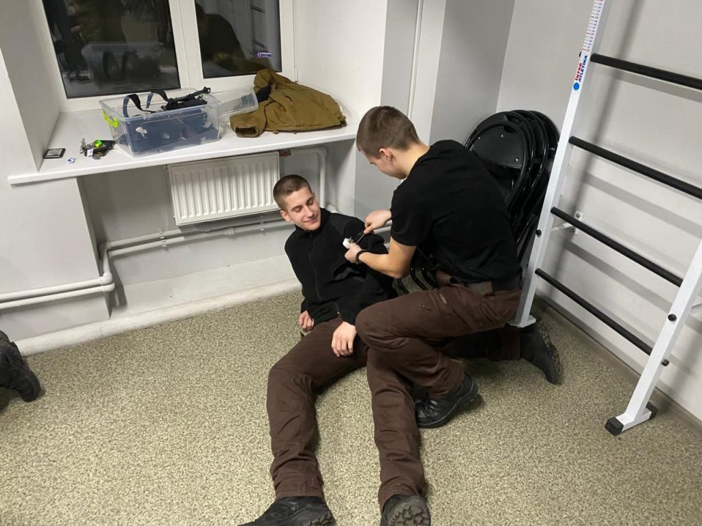 During the practical session, the lyceum students practiced algorithms for stopping massive bleeding through the application of tourniquets. From the instructors, they learned which parts of the body tourniquets can be applied to without posing a threat to the victim’s life, after which they practiced the procedure in pairs. Using simulation models, the students attempted wound packing on their own and mastered the correct use of various types of bandages.