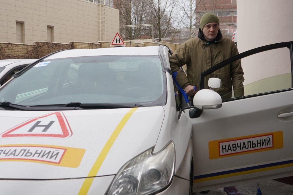 Military veterans communicated with a driver-instructor and inspected a specially adapted car that is used for practical lessons.