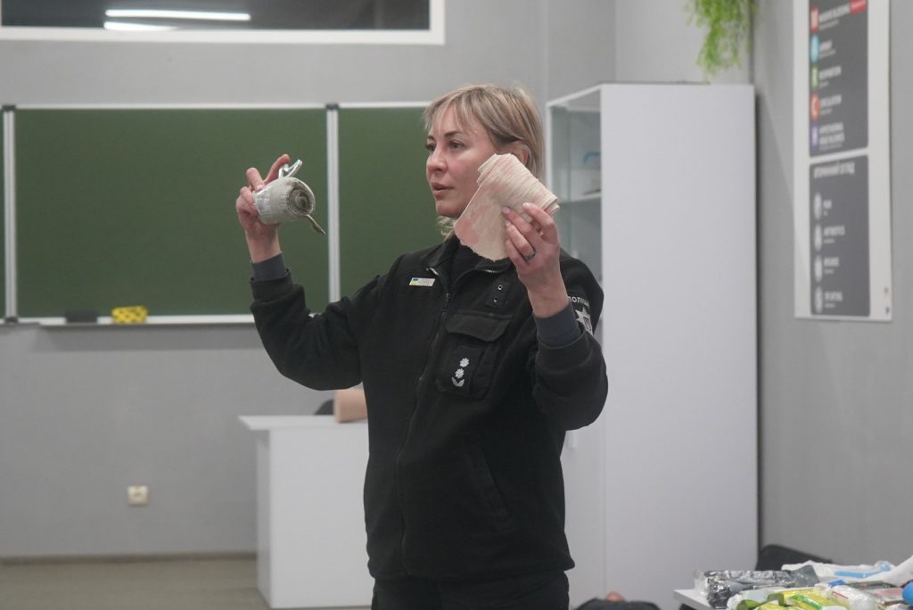 During the next tactical medicine class, Luhansk region police officers practiced the algorithm for stopping massive hemorrhages according to the MARCH protocol (Massive hemorrhage, Airway, Respirations, Circulation, Head injury/Hypothermia).