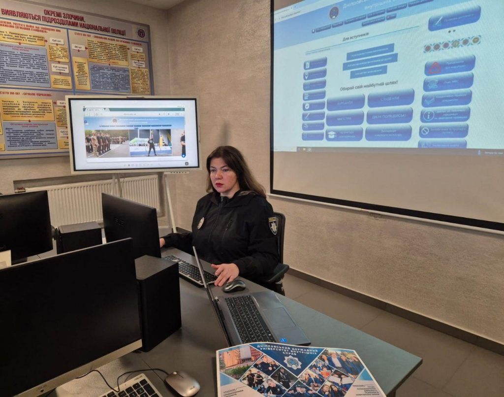 During the meeting, graduates were provided with key information about admission to the Dnipro State University of Internal Affairs, fields of study, main selection criteria, and the specifics of organizing the educational process. Particular attention was paid to the advantages of studying in the specialty D8 “Law” and opportunities for further employment. An online algorithm for applicant registration through filling out a form was also demonstrated.