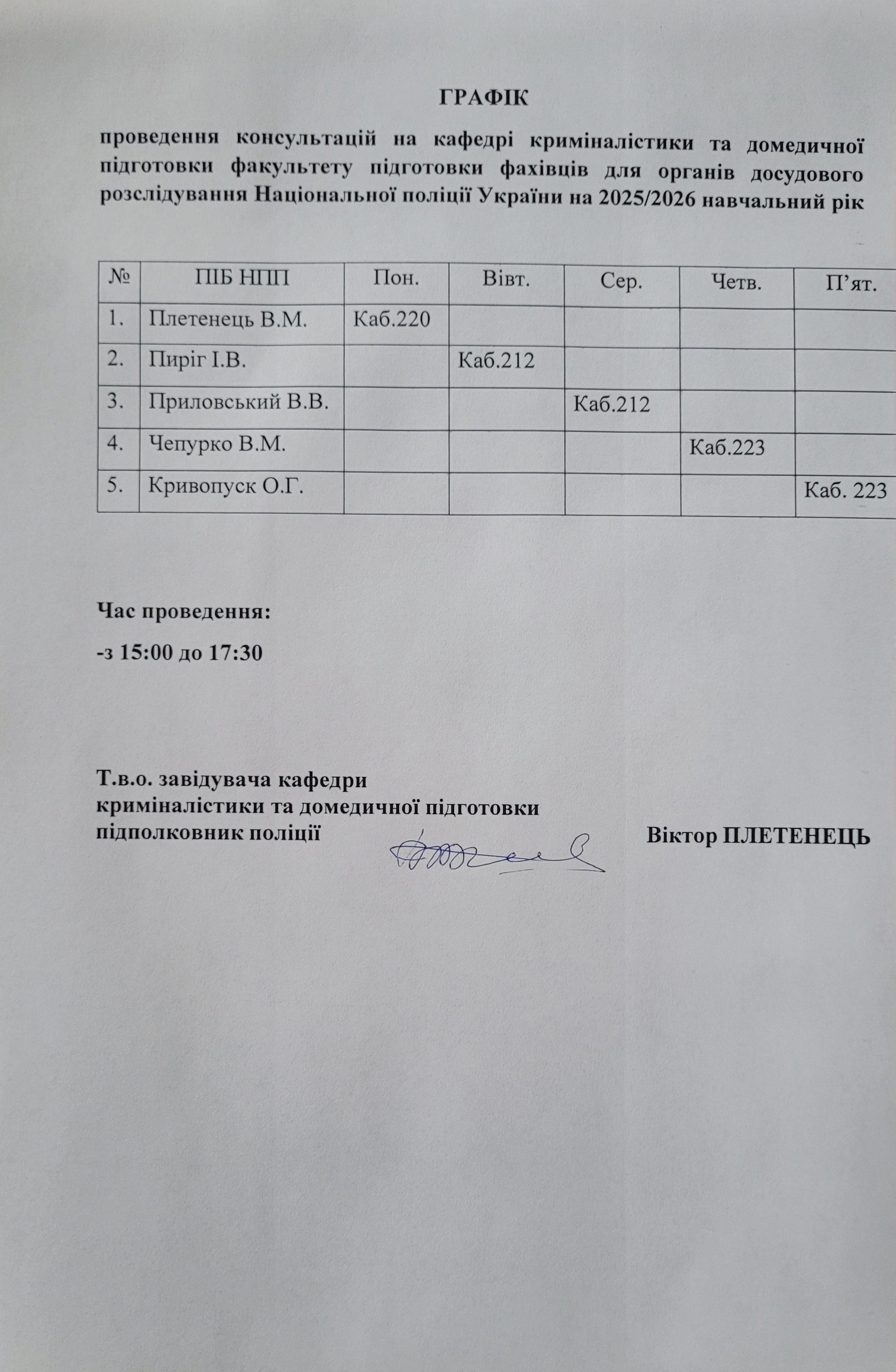 ➤ Графік проведення консультацій кафедри криміналістики та домедичної підготовки ФПФПОДР НПУ